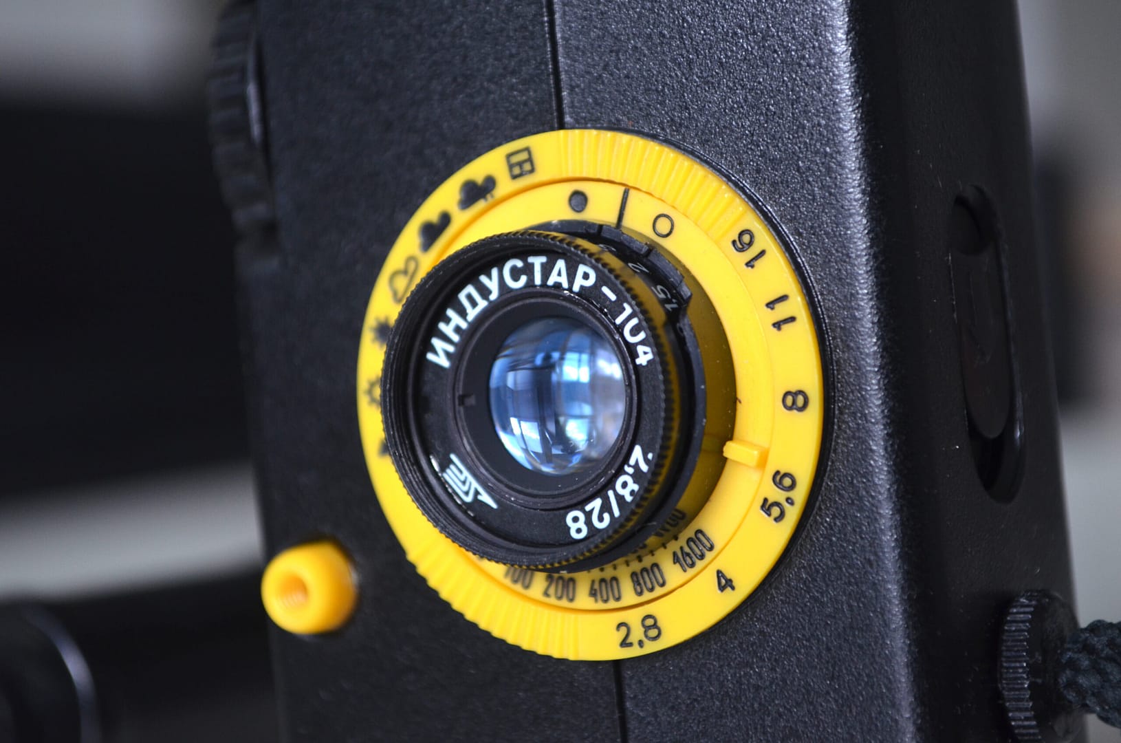 - Lens: Industar-104 (ИНДУСТАР), 28 mm f/2.8, glass triplet lens, filter slip-on